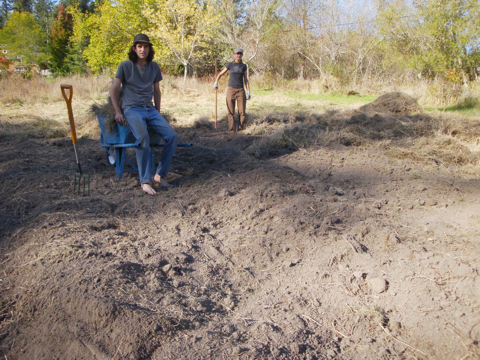 Chopping the clumps (not our toes...) with a digging fork to loosen the soil before raking. |
